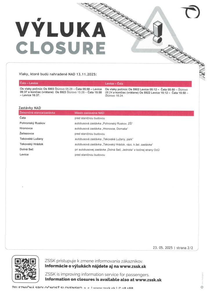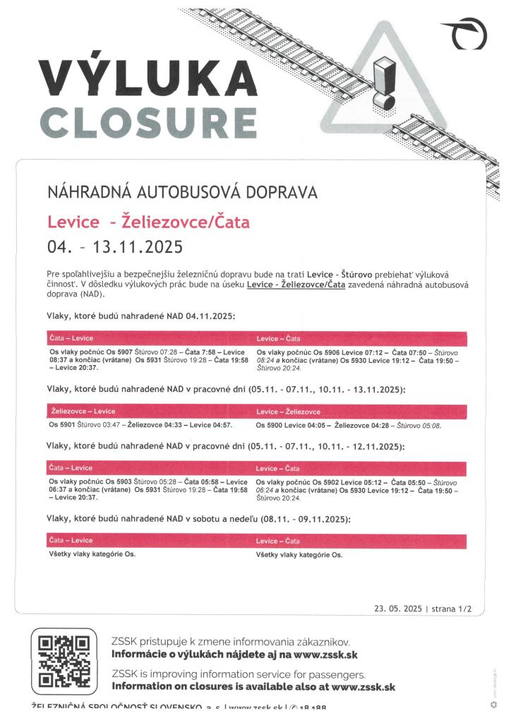 Oznámenie o konaní výluk v dňoch 04.11.2025 - 13.11.2025 v úseku trate Levice - Štúrovo.